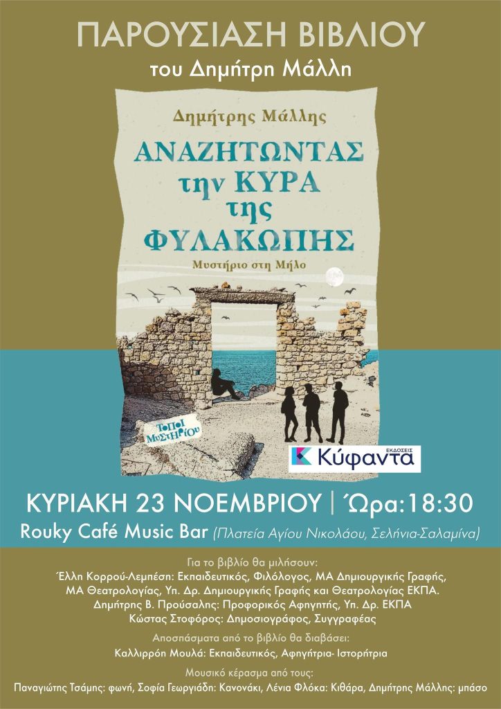 Οι Εκδόσεις Κύφαντα σας προσκαλούν στην παρουσίαση του βιβλίου του Δημήτρη Μάλλη την Κυριακή 23 Νοεμβρίου στις 18:30 στο Rouky Café Music Bar (Πλατεία Αγίου Νικολάου, Σελήνια Σαλαμίνα)