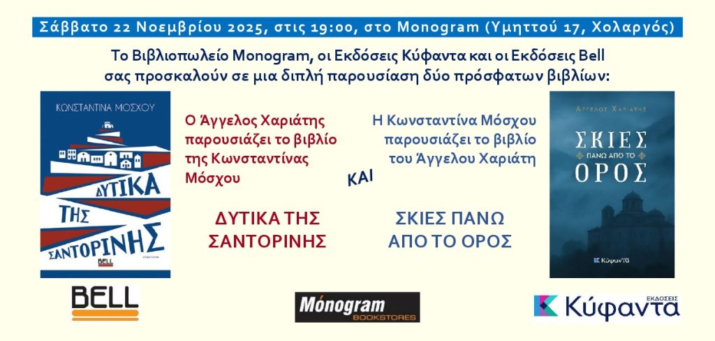 Το Βιβλιοπωλείο Monogram, οι Εκδόσεις Κύφαντα και οι Εκδόσεις Bell σας προσκαλούν σε μια διπλή παρουσίαση δύο πρόσφατων βιβλίων το Σάββατο 22 Νοεμβρίου στις 19:00 μ.μ. στον χώρο του βιβλιοπωλείου.